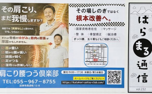NEW 2026年3月29日お知らせnews 『はら まる 通信』に掲載されました⭕️みなさん、いかがお過ごしでそうか。 今回は、肩こり腰つう倶楽部が「はら まる 通信」に掲載されたので、そのご報告。 季節の変わり目となるこの3月〜5月、ぎっくり腰や、身体の不調が増える時期。 こういう時期こそ、日頃の身体 […]